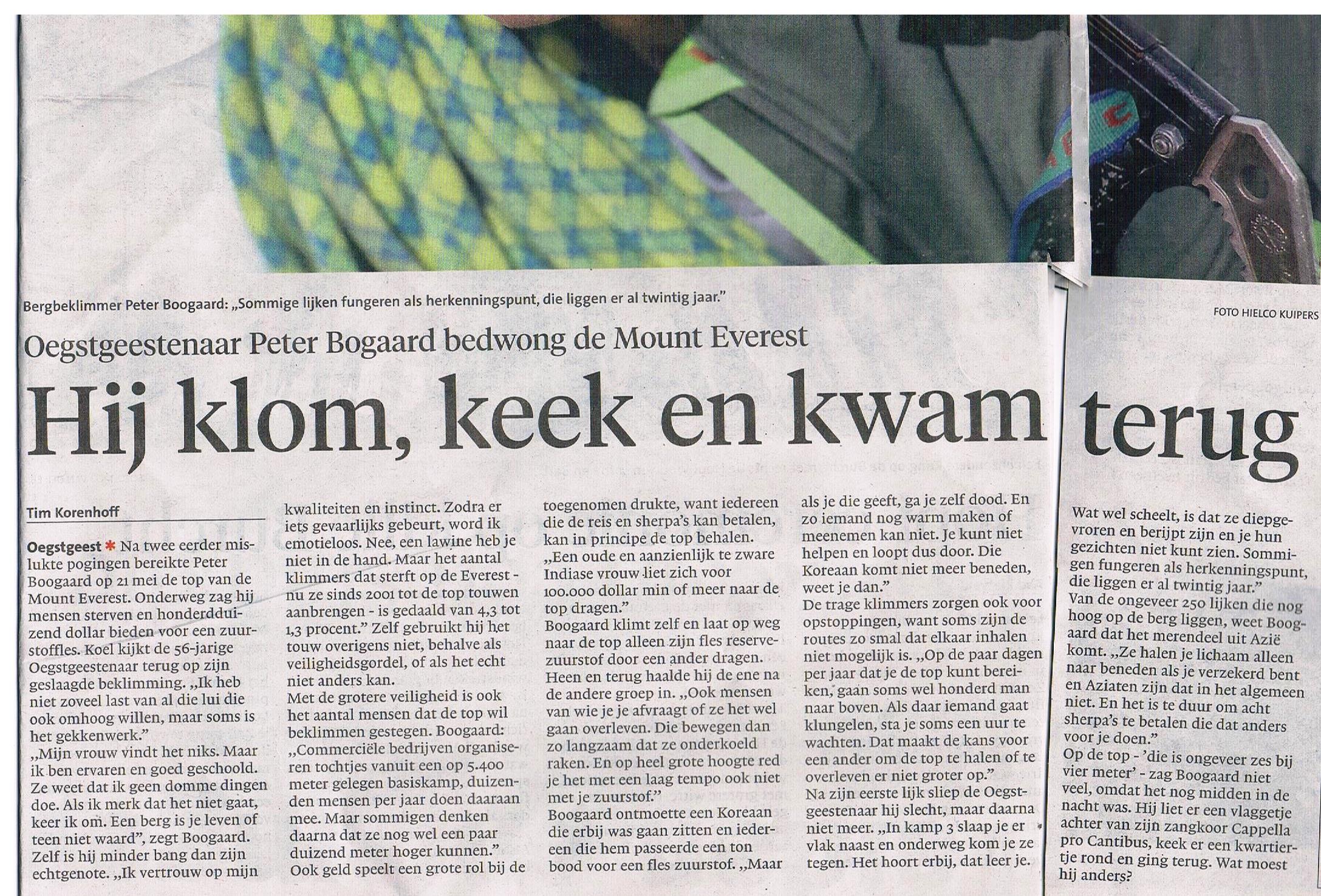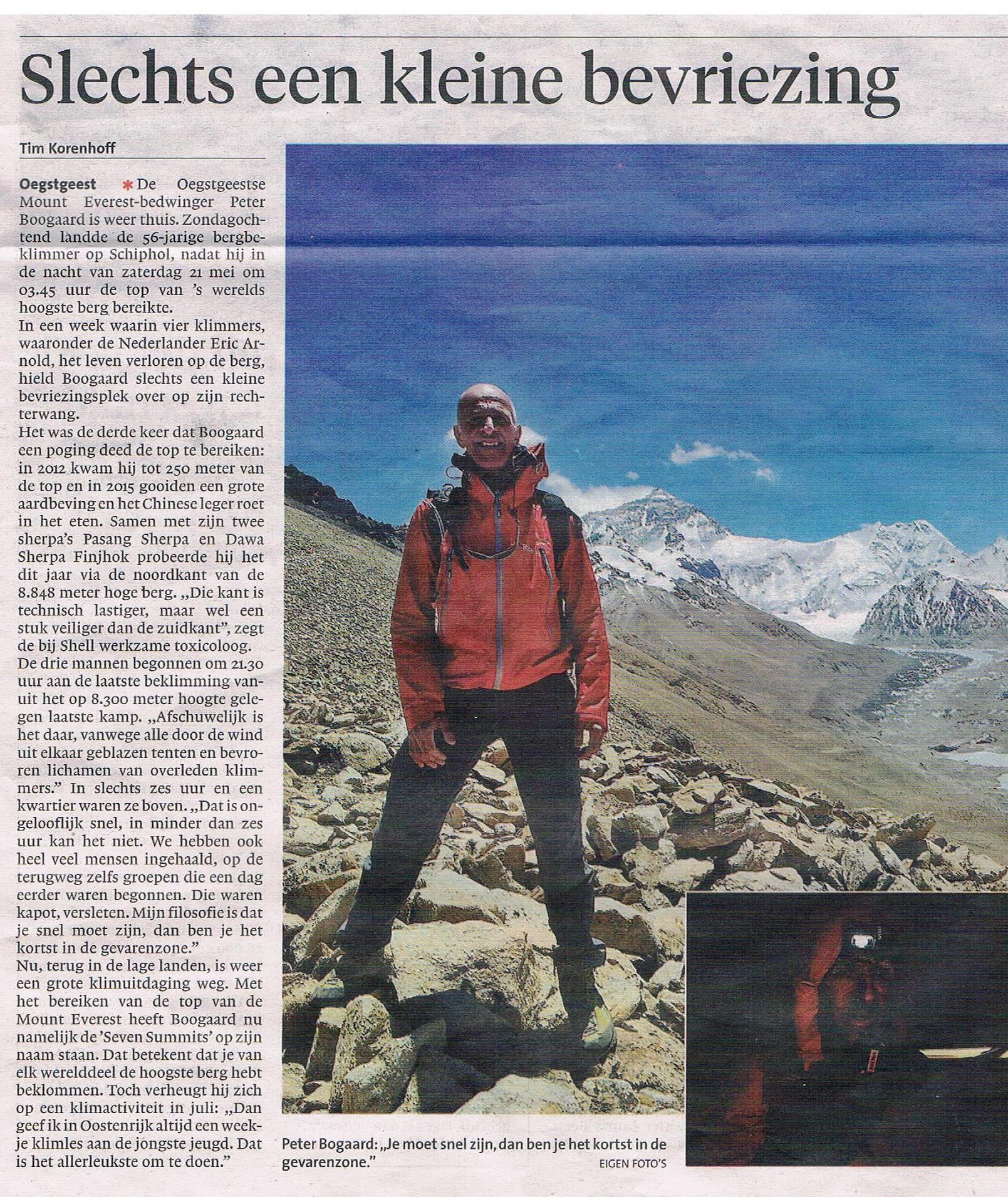 Peter Boogaard bereikte de top van de Mount Everest. In het Leidsch Dagblad schreef Tim twee artikelen over zijn prestatie.